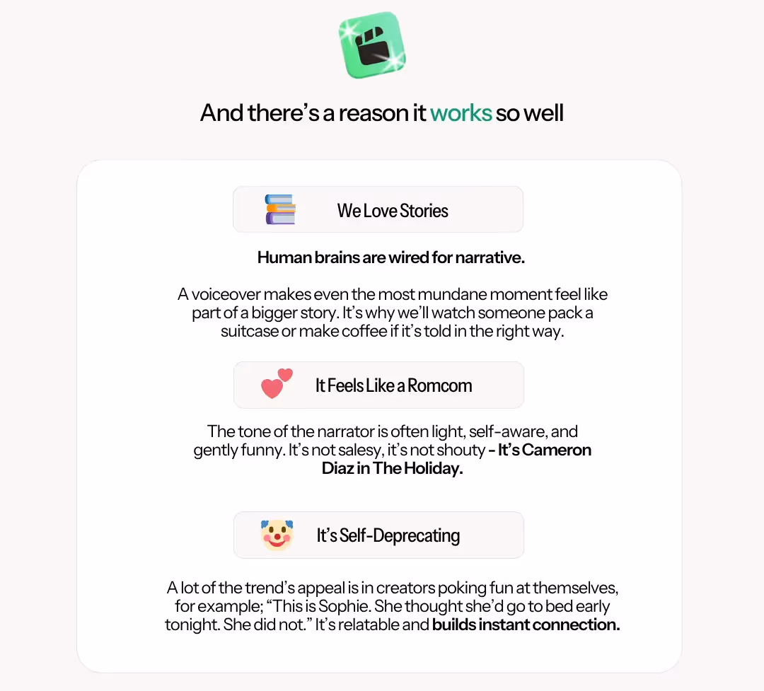 Let’s get into why this trend is working so well, why UGC creators are the secret to making it sing, and how you can brief a creator to bring your brand into the story—without it feeling forced.