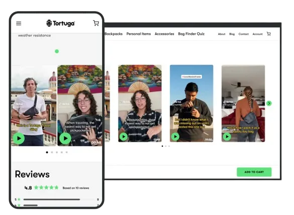 Tortuga Backpacks showcases a diverse range of shoppable UGC videos.