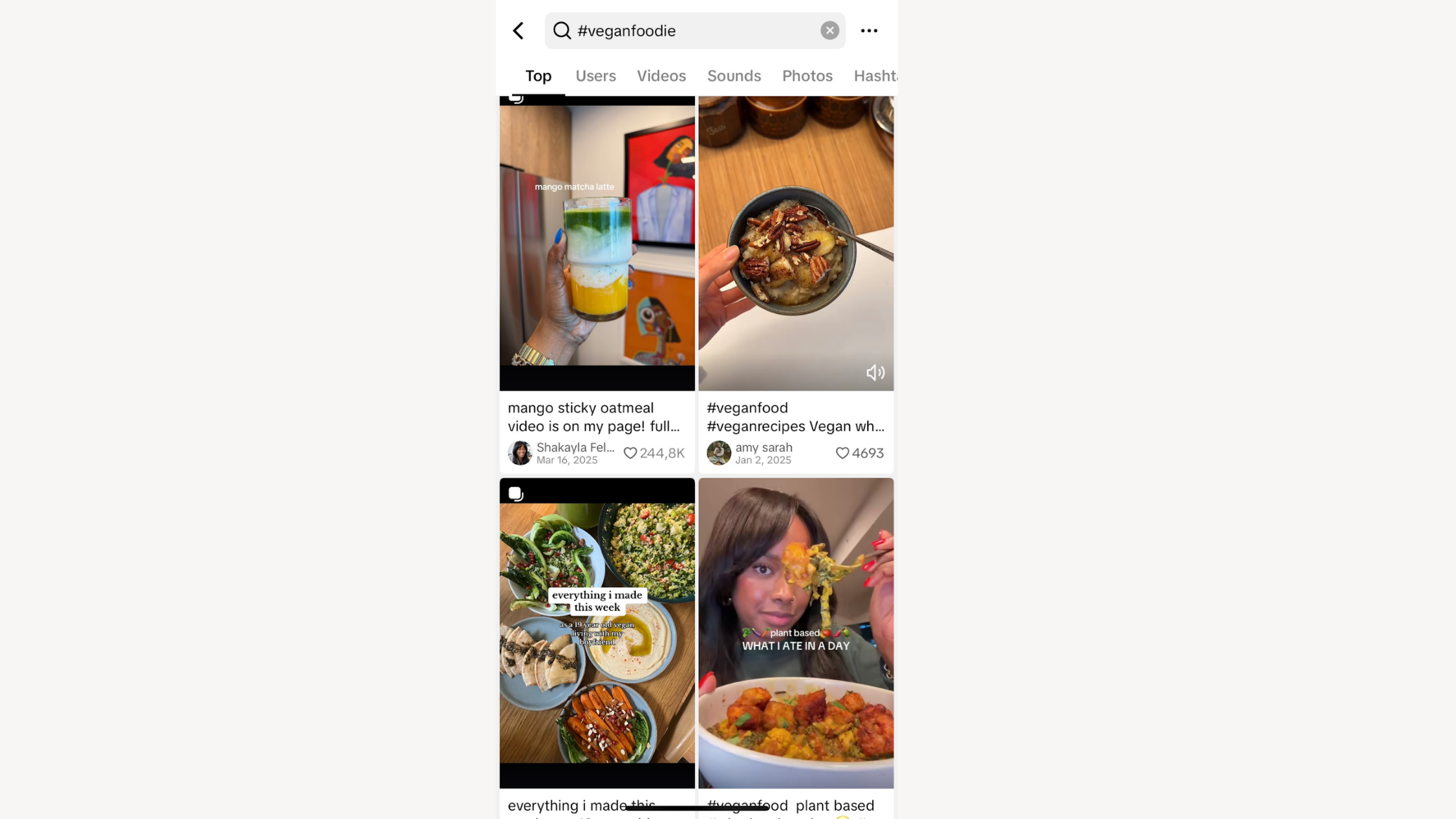 You can also search hashtags related to your industry or product category to find creators already producing relevant content. For example, if you’re looking for creators in the food niche, such as vegan influencers, searching hashtags like #veganfoodie or #veganfoodcreator can quickly surface relevant profiles.
